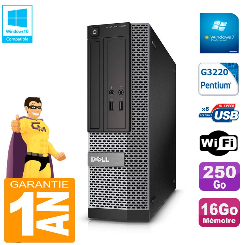 PC DELL 3020 SFF - Intel Pentium G3220 3.0GHz (3 Mo de cache) - 16Go DDR3 - Disque Dur 250Go - Graveur DVD - Clé WIFI USB - Windows 7 Pro - Garantie = 1 an.