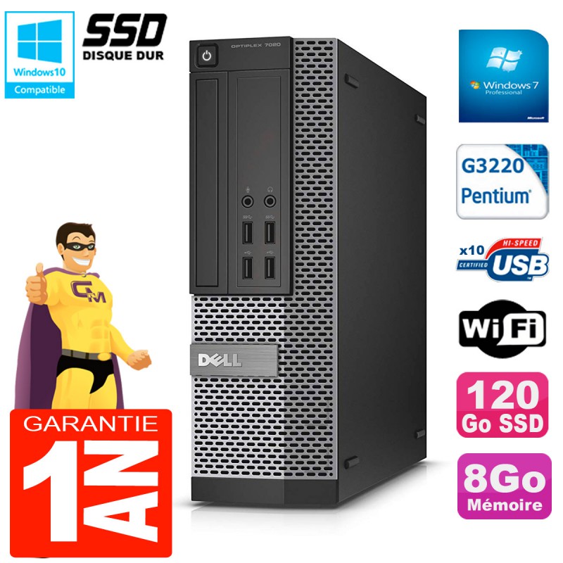 PC Dell Optiplex 7020 SFF - Intel Pentium G3220 3.0GHz (3 Mo de cache) - 8Go DDR3 - Disque Dur 120 Go SSD - Graveur DVD - Clé WIFI USB - Windows 7 Pro - Garantie = 1 an.