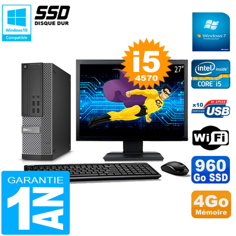 PC Dell Optiplex 7020 SFF - Intel Core I5-4570 3.20GHz (6 Mo de cache) - 4Go DDR3 - Disque Dur 960Go SSD - Graveur DVD - Clé WIFI USB - Windows 7 Pro - Pack Clavier + Souris + Ecran 27" ( Marque et modèle selon arrivages) - Garantie = 1 an.