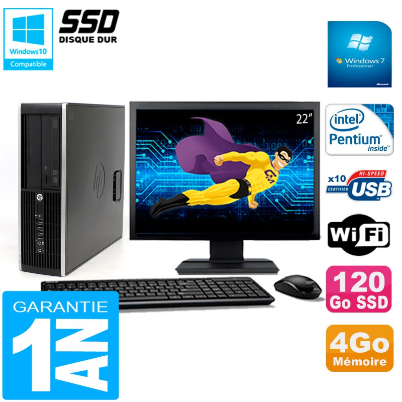PC HP Compaq 8300 SFF Ecran 22" Intel G850 RAM 4Go Disque 120 Go SSD Wifi W7