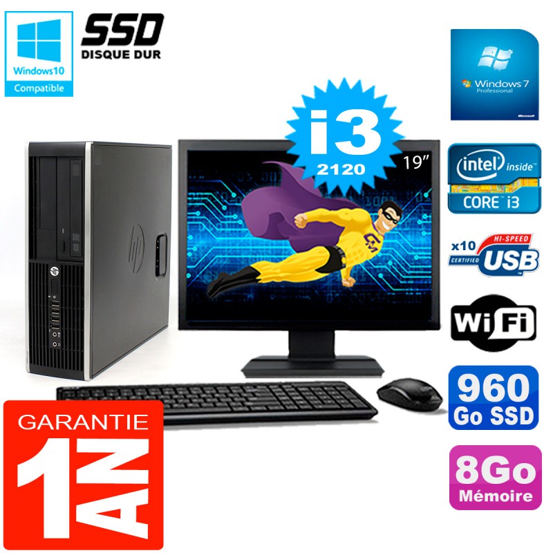 PC HP Compaq 8300 SFF Ecran 19" Core I3-2120 RAM 8Go Disque 960 Go SSD Wifi W7