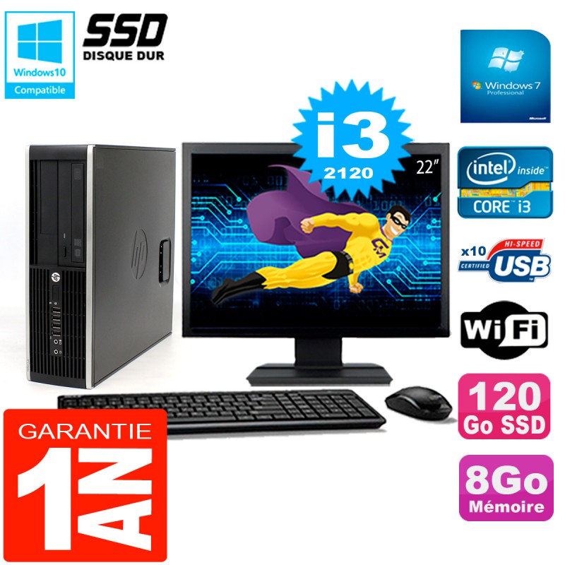 PC HP Compaq 8300 SFF Ecran 22" Core I3-2120 RAM 8Go Disque 120 Go SSD Wifi W7