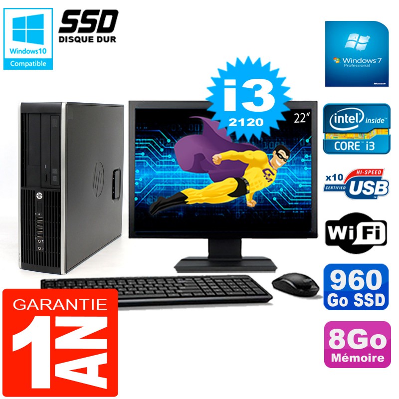 PC HP Compaq 8300 SFF Ecran 22" Core I3-2120 RAM 8Go Disque 960 Go SSD Wifi W7