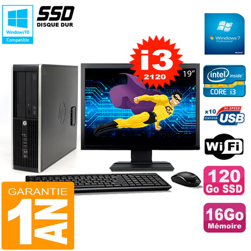 PC HP Compaq 8300 SFF Ecran 19" Core I3-2120 RAM 16Go Disque 120 Go SSD Wifi W7