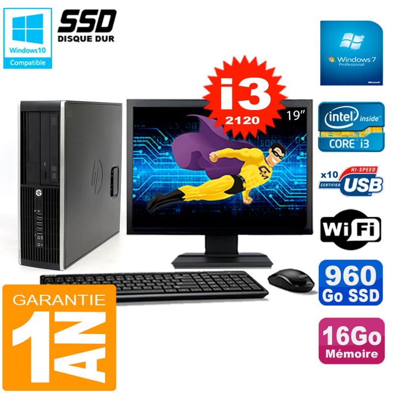 PC HP Compaq 8300 SFF Ecran 19" Core I3-2120 RAM 16Go Disque 960 Go SSD Wifi W7