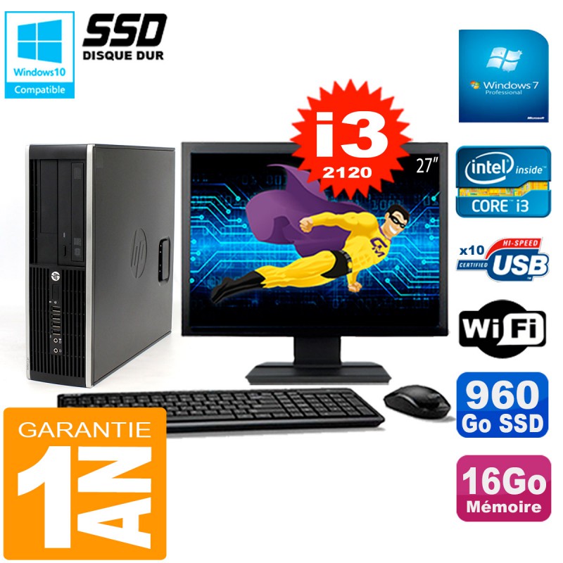 PC HP Compaq 8300 SFF Ecran 27" Core I3-2120 RAM 16Go Disque 960 Go SSD Wifi W7