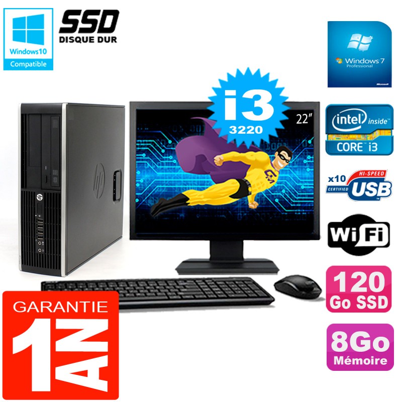 PC HP Compaq 8300 SFF Ecran 22" Core I3-3220 RAM 8Go Disque 120 Go SSD Wifi W7