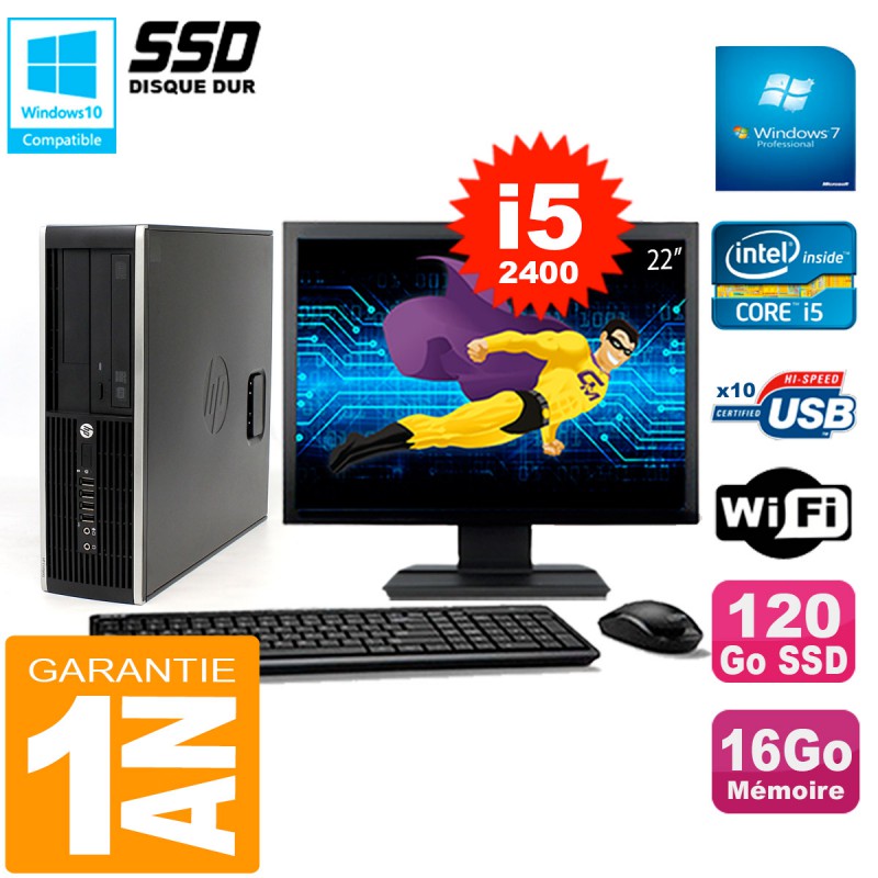PC HP Compaq 8300 SFF Ecran 22" Core I5-2400 RAM 16Go Disque 120 Go SSD Wifi W7
