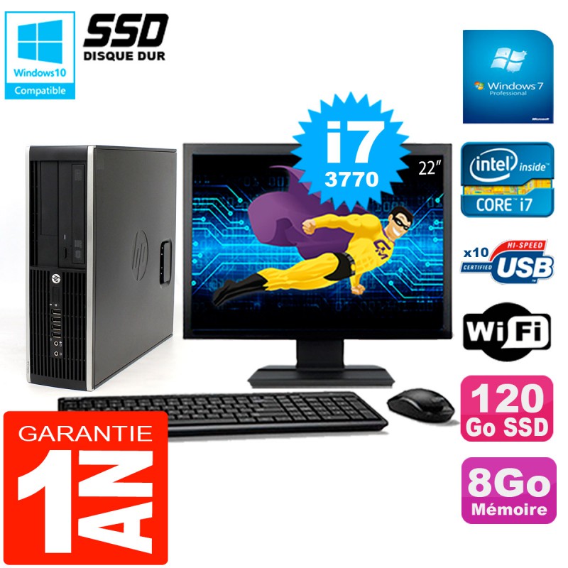 PC HP Compaq 8300 SFF Ecran 22" Core I7-3770 RAM 8Go Disque 120 Go SSD Wifi W7