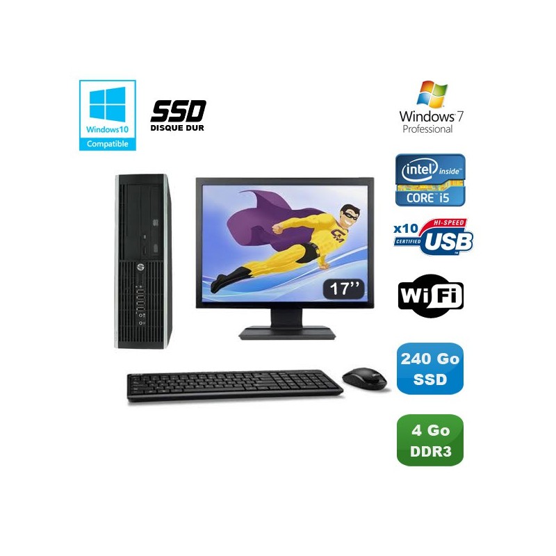 Lot PC HP Elite 8100 SFF - Intel Core i5 650 3.2GHz (Turbo 3.46Ghz) - 2 Coeurs (4 Threads) - RAM 4 Go - SSD 240Go Neuf - Graveur DVD - Clé WIFI USB - Windows 7 Pro - Pack Ecran 17" / Clavier / Souris (modèles selon arrivages) - Garantie = 6 mois.