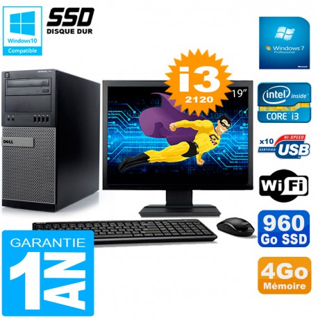 PC Tour DELL Optiplex 7010 MT - Intel Core I3-2120 3.30Ghz (3 Mo de cache) - 4 Go DDR3 - Disque Dur 960 Go SSD - Graveur DVD - Clé WIFI USB - Windows 7 Pro - Pack Clavier + Souris + Ecran 19" ( Marque et modèle selon arrivages) - Garantie = 1 an.
