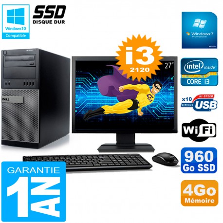 PC Tour DELL Optiplex 7010 MT - Intel Core I3-2120 3.30Ghz (3 Mo de cache) - 4 Go DDR3 - Disque Dur 960 Go SSD - Graveur DVD - Clé WIFI USB - Windows 7 Pro - Pack Clavier + Souris + Ecran 27" ( Marque et modèle selon arrivages) - Garantie = 1 an.