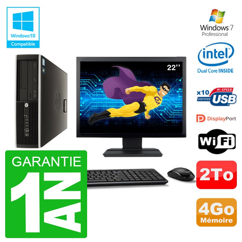 PC HP Elite 8100 SFF - Intel Pentium G6950 2.80GHz (3 Mo de cache) - 4 Go DDR3 - Disque Dur 3,5" 2 To - Graveur DVD - Clé WIFI USB - Windows 7 Pro - Livré avec Ecran 22" + clavier + souris (Marques et modèles selon arrivages) - Garantie 1 an.