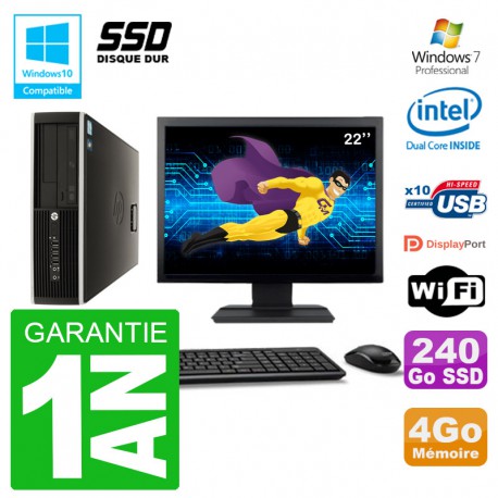 PC HP Elite 8100 SFF - Intel Pentium G6950 2.80GHz (3 Mo de cache) - 4 Go DDR3 - Disque Dur SSD 240 Go - Graveur DVD - Clé WIFI USB - Windows 7 Pro - Livré avec Ecran 22" + clavier + souris (Marques et modèles selon arrivages) - Garantie 1 an.