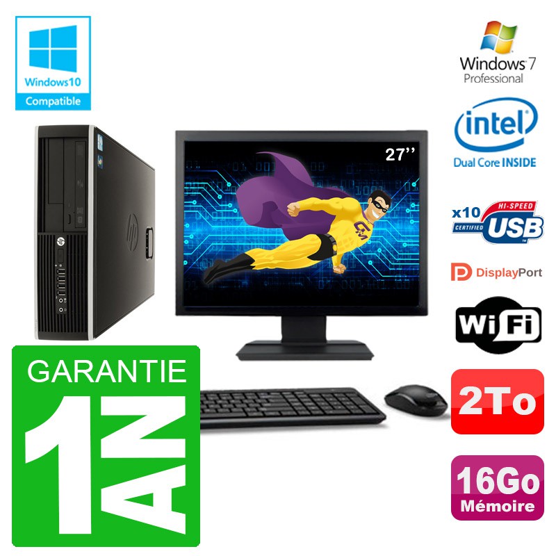 PC HP Elite 8100 SFF - Intel Pentium G6950 2.80GHz (3 Mo de cache) - 16 Go DDR3 - Disque Dur 3,5" 2 To - Graveur DVD - Clé WIFI USB - Windows 7 Pro - Livré avec Ecran 27" + clavier + souris (Marques et modèles selon arrivages) - Garantie 1 an.