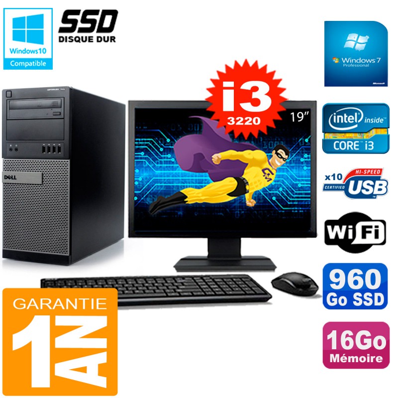 PC Tour DELL Optiplex 7010 MT - Intel Core I3-3220 3.30Ghz (3 Mo de cache) - 16 Go DDR3 - Disque Dur 960 Go SSD - Graveur DVD - Clé WIFI USB - Windows 7 Pro - Pack Clavier + Souris + Ecran 19" ( Marque et modèle selon arrivages) - Garantie = 1 an.