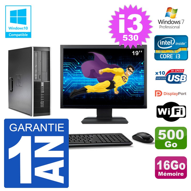 PC HP Elite 8100 SFF - Intel Core I3-530 2,93 Ghz (4 Mo de cache) - 16 Go DDR3 - Disque Dur 3,5" 500 Go - Graveur DVD - Clé WIFI USB - Windows 7 Pro - Livré avec Ecran 19" + clavier + souris (Marques et modèles selon arrivages) - Garantie 1 an.