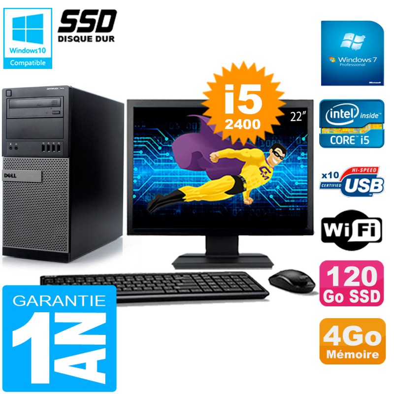 PC Tour DELL 7010 Ecran 22" Core I5-2400 RAM 4Go Disque 120 Go SSD Wifi W7