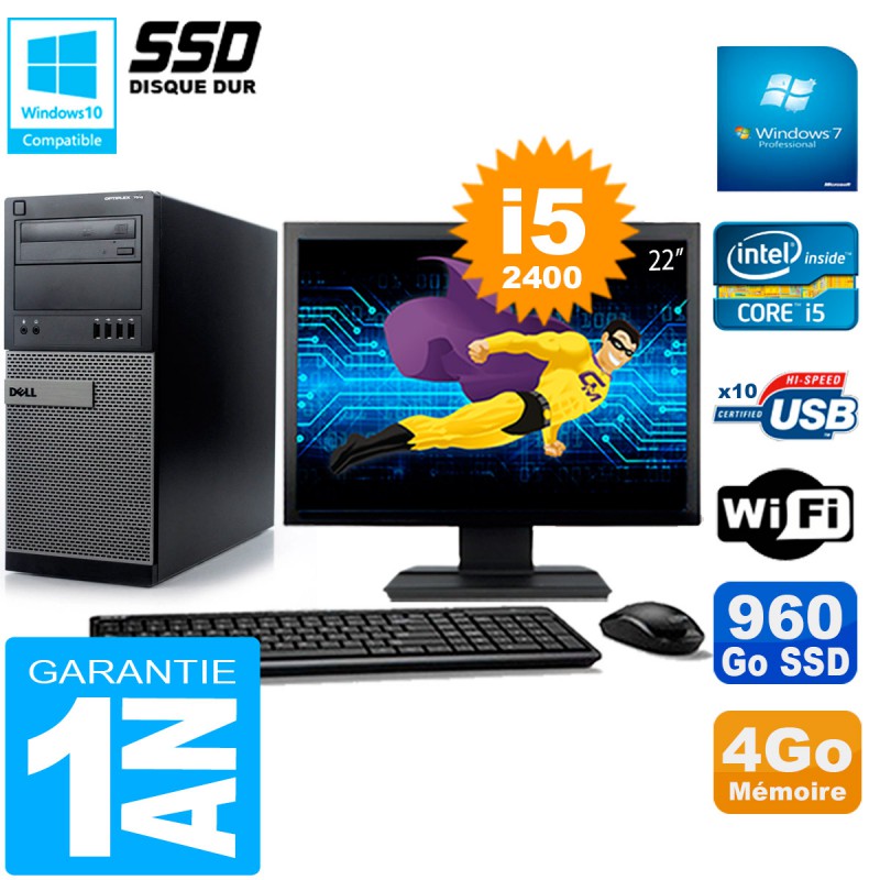 PC Tour DELL Optiplex 7010 MT - Intel Core I5-2400 3.10Ghz (6 Mo de cache) - 4 Go DDR3 - Disque Dur 960 Go SSD - Graveur DVD - Clé WIFI USB - Windows 7 Pro - Pack Clavier + Souris + Ecran 22" ( Marque et modèle selon arrivages) - Garantie = 1 an.