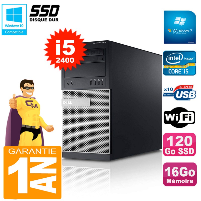 PC Tour DELL Optiplex 7010 MT - Intel Core I5-2400 3.10Ghz (6 Mo de cache) - 16 Go DDR3 - Disque Dur 120 Go SSD - Graveur DVD - Clé WIFI USB - Windows 7 Pro - Garantie = 1 an.