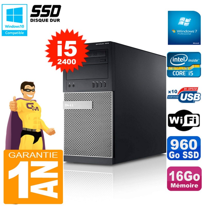 PC Tour DELL Optiplex 7010 MT - Intel Core I5-2400 3.10Ghz (6 Mo de cache) - 16 Go DDR3 - Disque Dur 960 Go SSD - Graveur DVD - Clé WIFI USB - Windows 7 Pro - Garantie = 1 an.