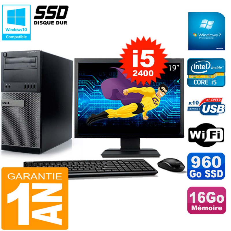 PC Tour DELL Optiplex 7010 MT - Intel Core I5-2400 3.10Ghz (6 Mo de cache) - 16 Go DDR3 - Disque Dur 960 Go SSD - Graveur DVD - Clé WIFI USB - Windows 7 Pro - Pack Clavier + Souris + Ecran 19" ( Marque et modèle selon arrivages) - Garantie = 1 an.