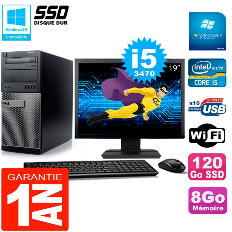 PC Tour DELL Optiplex 7010 MT - Intel Core I5-3470 3.20Ghz (6 Mo de cache) - 8 Go DDR3 - Disque Dur 120 Go SSD - Graveur DVD - Clé WIFI USB - Windows 7 Pro - Pack Clavier + Souris + Ecran 19" ( Marque et modèle selon arrivages) - Garantie = 1 an.