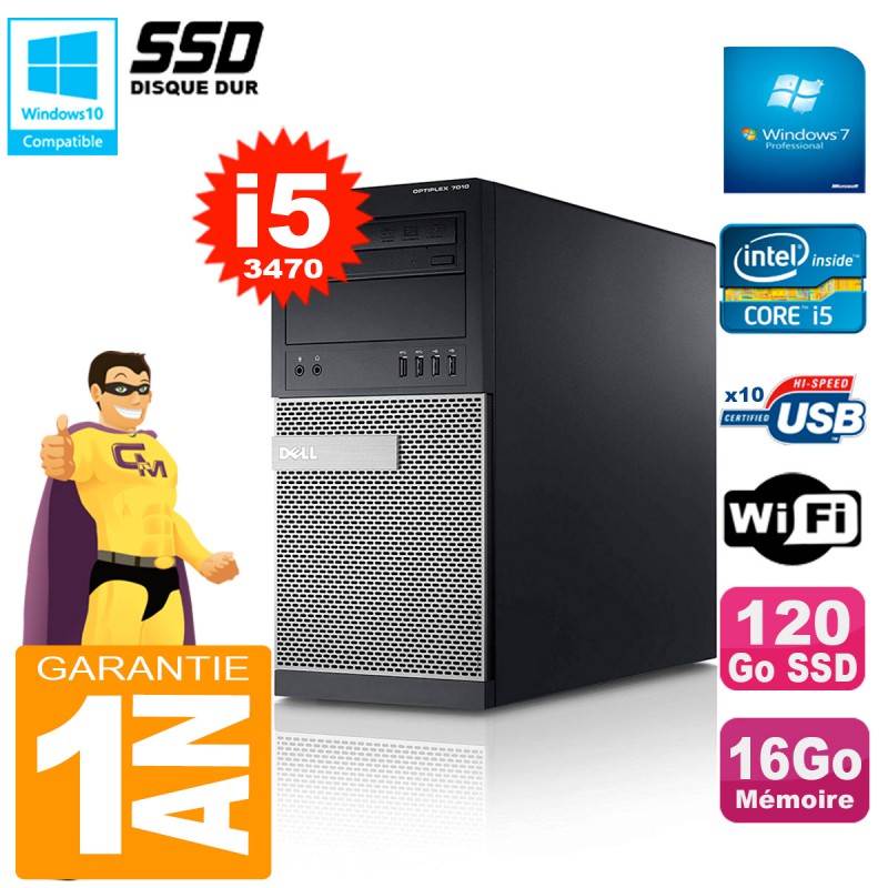 PC Tour DELL Optiplex 7010 MT - Intel Core I5-3470 3.20Ghz (6 Mo de cache) - 16 Go DDR3 - Disque Dur 120 Go SSD - Graveur DVD - Clé WIFI USB - Windows 7 Pro - Garantie = 1 an.