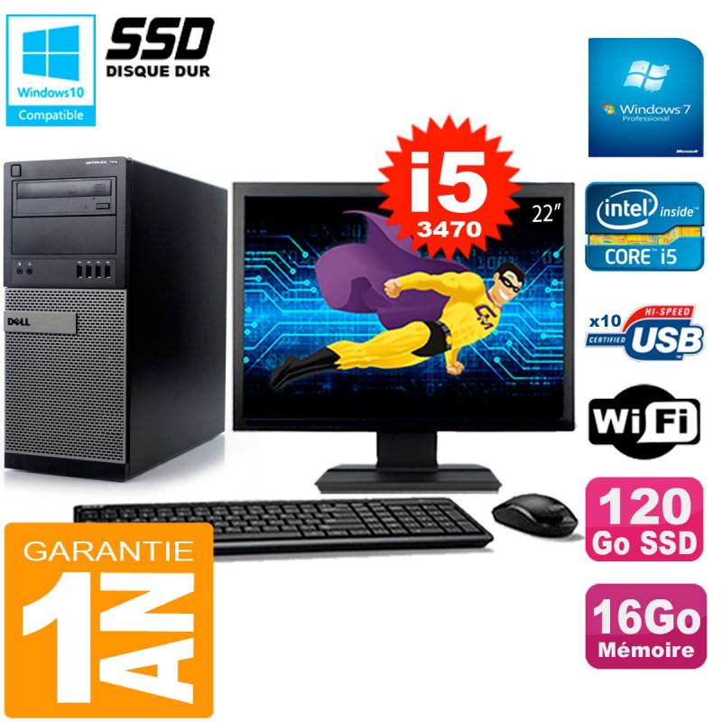 PC Tour DELL Optiplex 7010 MT - Intel Core I5-3470 3.20Ghz (6 Mo de cache) - 16 Go DDR3 - Disque Dur 120 Go SSD - Graveur DVD - Clé WIFI USB - Windows 7 Pro - Pack Clavier + Souris + Ecran 22" ( Marque et modèle selon arrivages) - Garantie = 1 an.