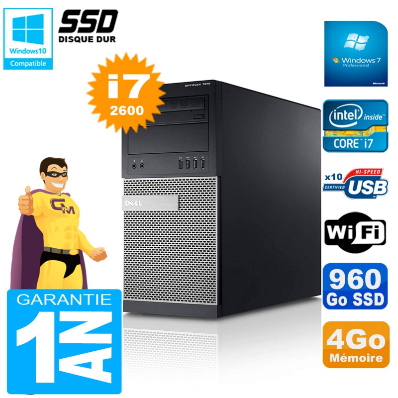 PC Tour DELL Optiplex 7010 MT - Intel Core I7-2600 3.40Ghz (8 Mo de cache) - 4 Go DDR3 - Disque Dur 960 Go SSD - Graveur DVD - Clé WIFI USB - Windows 7 Pro - Garantie = 1 an.
