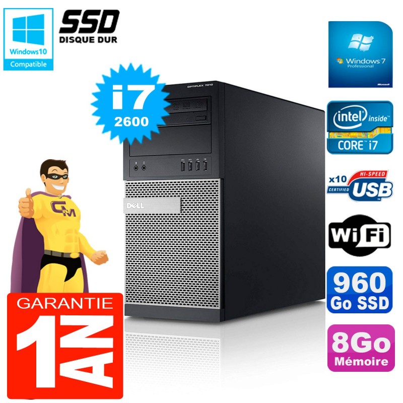 PC Tour DELL Optiplex 7010 MT - Intel Core I7-2600 3.40Ghz (8 Mo de cache) - 8 Go DDR3 - Disque Dur 960 Go SSD - Graveur DVD - Clé WIFI USB - Windows 7 Pro - Garantie = 1 an.
