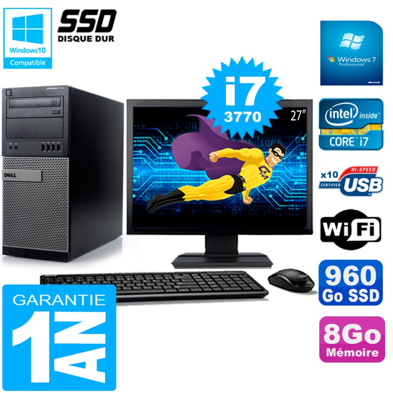PC Tour DELL Optiplex 7010 MT - Intel Core I7-3770 3.40Ghz (8 Mo de cache) - 8 Go DDR3 - Disque Dur 960 Go SSD - Graveur DVD - Clé WIFI USB - Windows 7 Pro - Pack Clavier + Souris + Ecran 27" ( Marque et modèle selon arrivages) - Garantie = 1 an.