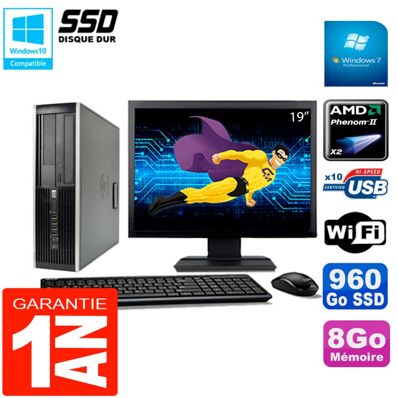 PC HP Compaq 6005 Pro SFF -AMD Phenom II X2 B57 3.2Ghz (6 Mo de cache) - 8 Go DDR3 - Disque Dur 960 Go SSD - Graveur DVD - Clé WIFI USB - Windows 7 Pro - Pack Clavier + Souris + Ecran 19" ( Marque et modèle selon arrivages) - Garantie = 1 an.