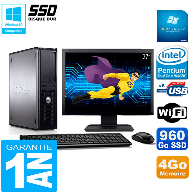 PC DELL Optiplex 780 DT - Intel Pentium E5300 2.60Ghz (2 Mo de cache) - 4 Go DDR3 - Disque Dur 960 Go SSD - Graveur DVD - Clé WIFI USB - Windows 7 Pro - Pack Clavier + Souris + Ecran 27" ( Marque et modèle selon arrivages) - Garantie = 1 an.