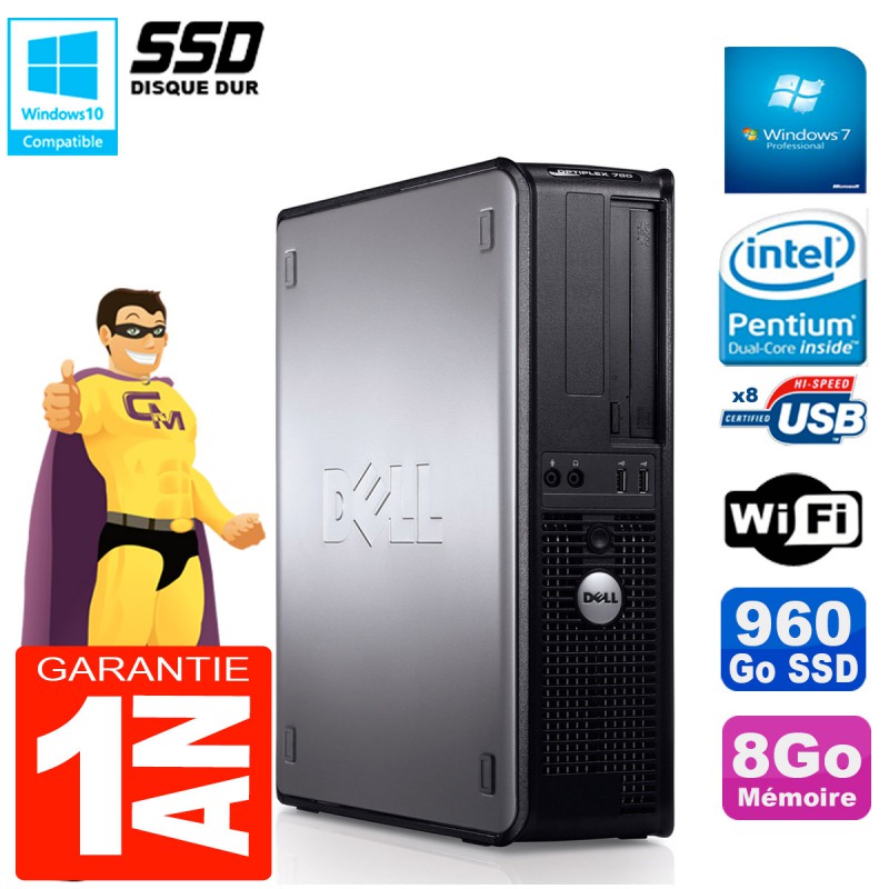 PC DELL Optiplex 780 DT - Intel Pentium E5300 2.60Ghz (2 Mo de cache) - 8 Go DDR3 - Disque Dur 960 Go SSD - Graveur DVD - Clé WIFI USB - Windows 7 Pro - Garantie = 1 an.