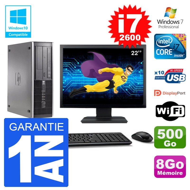 PC HP Elite 6200 SFF - Intel Core I7-2600 3,40 Ghz (8 Mo de cache) - 8 Go DDR3 - Disque Dur 3,5" 500 Go - Graveur DVD - Clé WIFI USB - Windows 7 Pro - Livré avec Ecran 22" + clavier + souris (Marques et modèles selon arrivages) - Garantie 1 an.