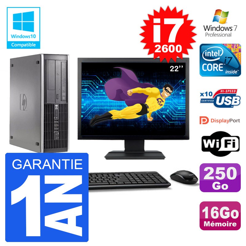 PC HP 6200 SFF Ecran 22" Intel i7-2600 RAM 16Go Disque 250Go Graveur DVD Wifi W7