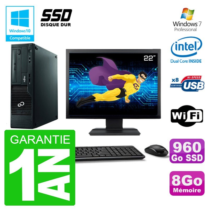 PC Fujitsu Esprimo E500 E85+ DT - Intel Pentium Dual-Core G640 2.8 Ghz (Cache 3 Mo) - 8 Go DDR3 - Disque Dur SSD 960 Go - Graveur DVD - Clé WIFI USB - Windows 7 Pro - Avec Ecran 22" + clavier + souris (Marques et modèles variables) - Garantie 1 an