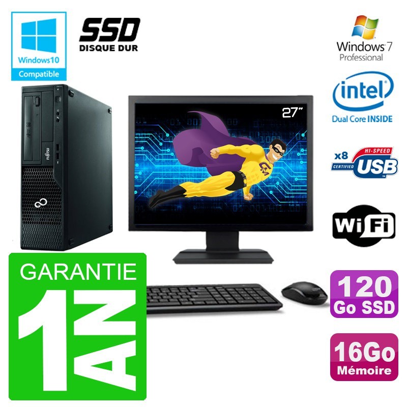PC Fujitsu Esprimo E500 E85+ DT - Intel Pentium Dual-Core G640 2.8 Ghz (Cache 3 Mo) - 16 Go DDR3 - Disque Dur SSD 120 Go - Graveur DVD - Clé WIFI USB - Windows 7 Pro - Avec Ecran 27" + clavier + souris (Marques et modèles variables) - Garantie 1 an