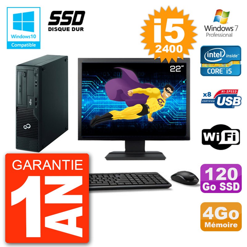 PC Fujitsu Esprimo E500 E85+ DT - Intel Core I5-2400 3.1 Ghz (Cache 6 Mo) - 4 Go DDR3 - Disque Dur SSD 120 Go - Graveur DVD - Clé WIFI USB - Windows 7 Pro - Avec Ecran 22" + clavier + souris (Marques et modèles variables) - Garantie 1 an