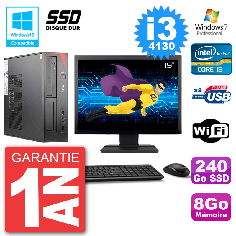 PC Fujitsu Esprimo E520 DT - Intel Core I3-4130 3.4 Ghz (Cache 3 Mo) - 8 Go DDR3 - Disque Dur SSD 240 Go - Graveur DVD - Clé WIFI USB - Windows 7 Pro - Livré avec Ecran 19" + clavier + souris (Marques et modèles variables) - Garantie 1 an