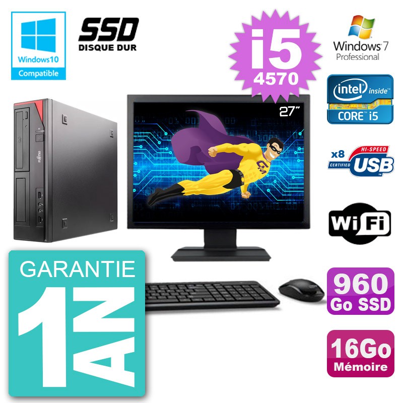 PC Fujitsu Esprimo E520 DT - Intel Core I5-4570 3.2 Ghz (Cache 6 Mo) - 16 Go DDR3 - Disque Dur SSD 960 Go - Graveur DVD - Clé WIFI USB - Windows 7 Pro - Livré avec Ecran 27" + clavier + souris (Marques et modèles variables) - Garantie 1 an