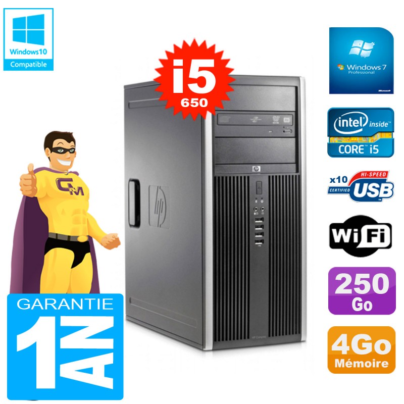 PC Hp Compaq 8100 Elite MT - Intel Core i5-650 3.2 Ghz (Cache 4 Mo) - 4 Go DDR3 - Disque Dur 3,5" 250 Go - Graveur DVD - Clé WIFI USB - Windows 7 Pro - Garantie 1 an