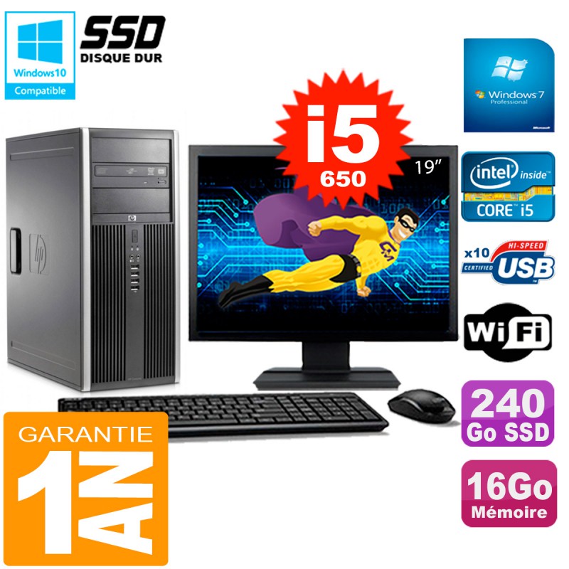 PC Hp Compaq 8100 Elite MT - Intel Core i5-650 3.2 Ghz (Cache 4 Mo) - 16 Go DDR3 - Disque Dur SSD 240 Go - Graveur DVD - Clé WIFI USB - Windows 7 Pro - Livré avec Ecran 19" + clavier + souris (Marques et modèles variables) - Garantie 1 an