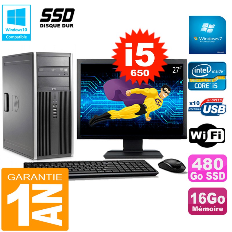 PC Hp Compaq 8100 Elite MT - Intel Core i5-650 3.2 Ghz (Cache 4 Mo) - 16 Go DDR3 - Disque Dur SSD 480 Go - Graveur DVD - Clé WIFI USB - Windows 7 Pro - Livré avec Ecran 27" + clavier + souris (Marques et modèles variables) - Garantie 1 an
