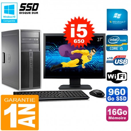 PC Hp Compaq 8100 Elite MT - Intel Core i5-650 3.2 Ghz (Cache 4 Mo) - 16 Go DDR3 - Disque Dur SSD 960 Go - Graveur DVD - Clé WIFI USB - Windows 7 Pro - Livré avec Ecran 27" + clavier + souris (Marques et modèles variables) - Garantie 1 an
