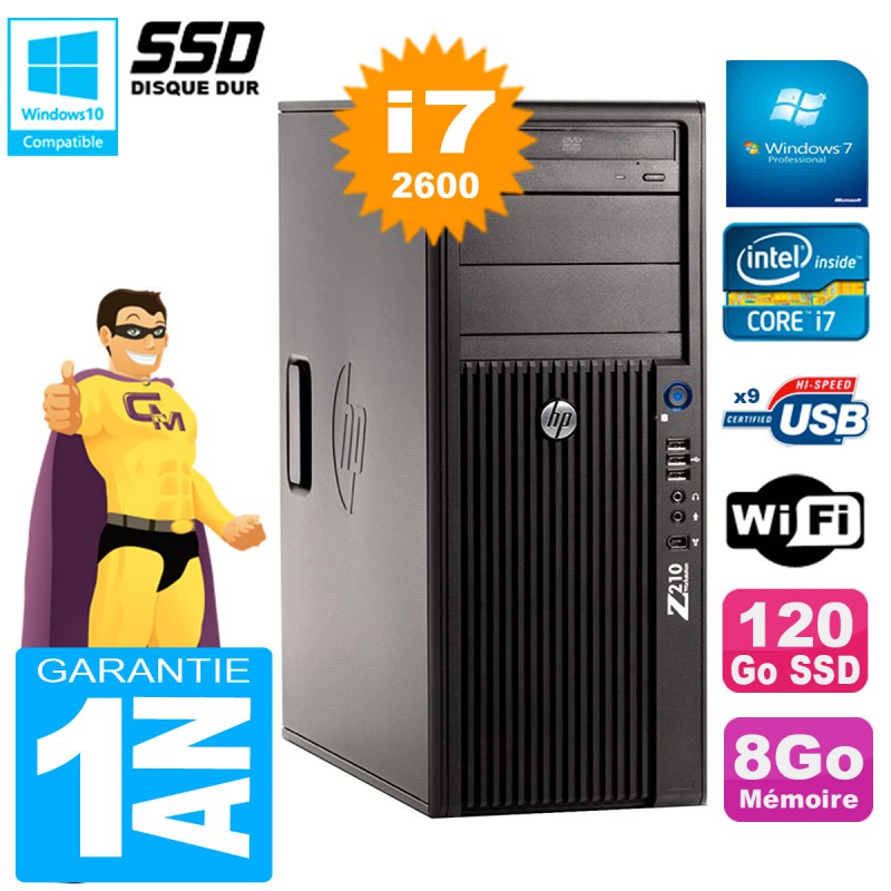 PC HP WorkStation Z210 Tour - Intel Core i7-2600 3.40 Ghz (Cache 8 Mo) - 8 Go DDR3 - Disque Dur SSD 120 Go - Graveur DVD - Clé WIFI USB - Windows 7 Pro - Garantie 1 an