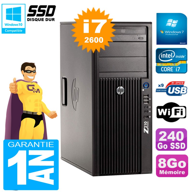PC HP WorkStation Z210 Tour - Intel Core i7-2600 3.40 Ghz (Cache 8 Mo) - 8 Go DDR3 - Disque Dur SSD 240 Go - Graveur DVD - Clé WIFI USB - Windows 7 Pro - Garantie 1 an