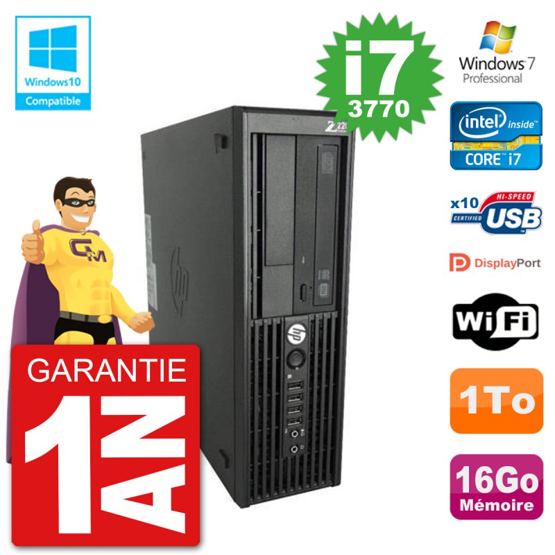 PC HP WorkStation Z220 SFF - Intel Core I7-3770 3.4 Ghz (Cache 8 Mo) - 16 Go DDR3 - Disque Dur 3,5" 1 To - Graveur DVD - Clé WIFI USB - Windows 7 Pro - Garantie 1 an.