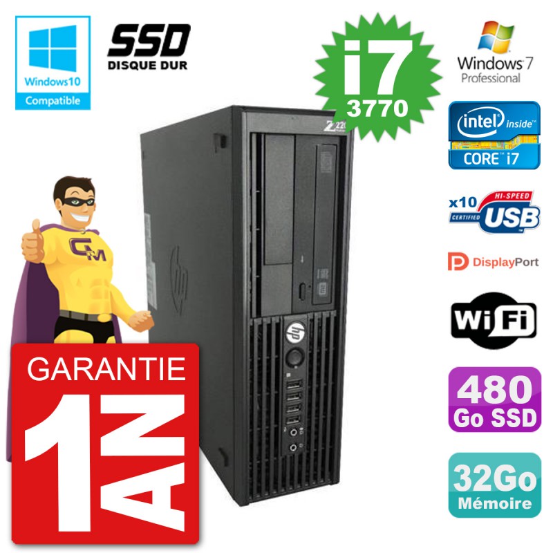 PC HP WorkStation Z220 SFF - Intel Core I7-3770 3.4 Ghz (Cache 8 Mo) - 32 Go DDR3 - Disque Dur SSD 480 Go - Graveur DVD - Clé WIFI USB - Windows 7 Pro - Garantie 1 an.